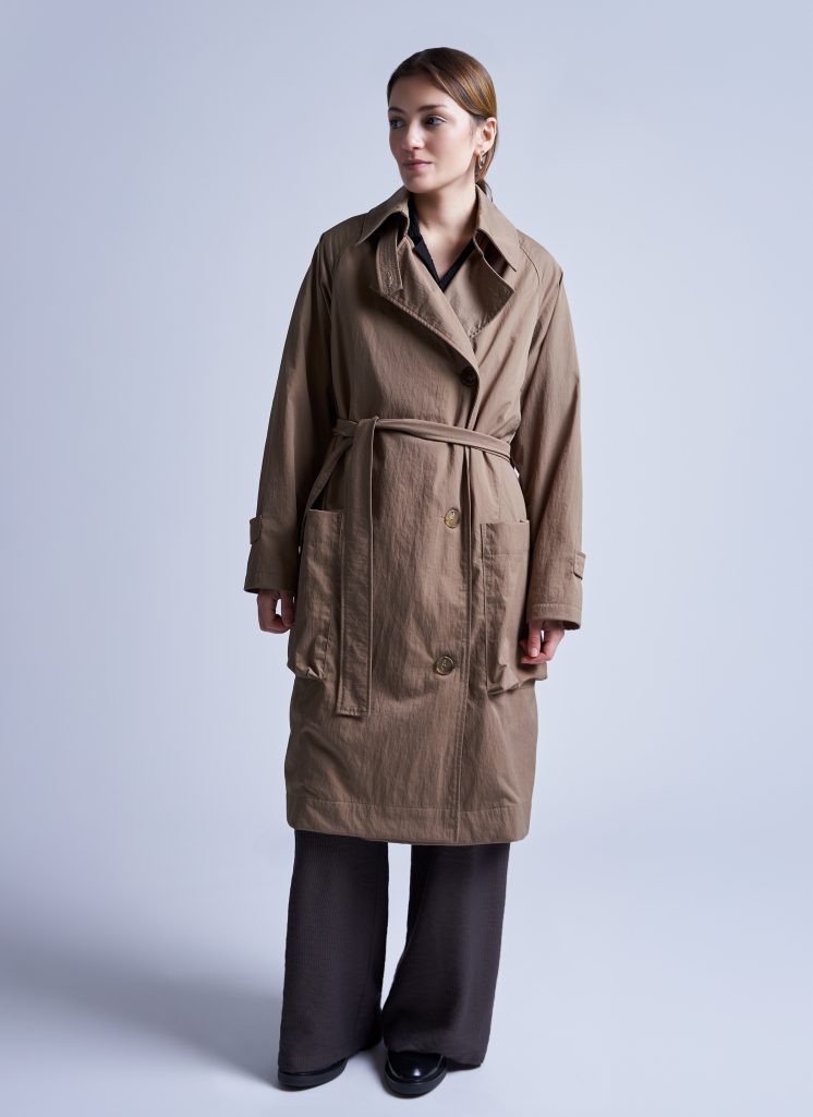 PTNTDKW-PeakedLapelTrenchCoatInDarkKhakiNylonTwill(WomensCut)-01 | PEAKED LAPEL TRENCH COAT IN DARK KHAKI (WOMEN’S CUT)