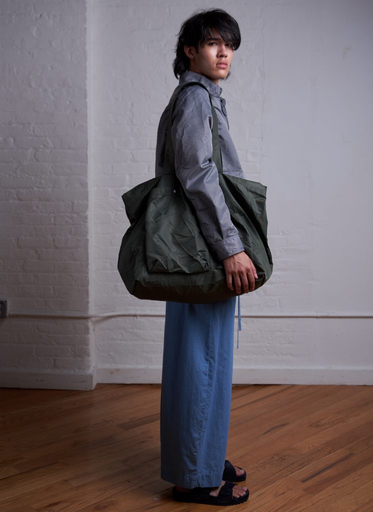 STCNPG01-TriPocketSlouchyToteInPewterGreenCrushedNylonTwill-02 | OVERSIZED IO SHIRT IN BLUE MIX WIDE RIPPLE STRIPE