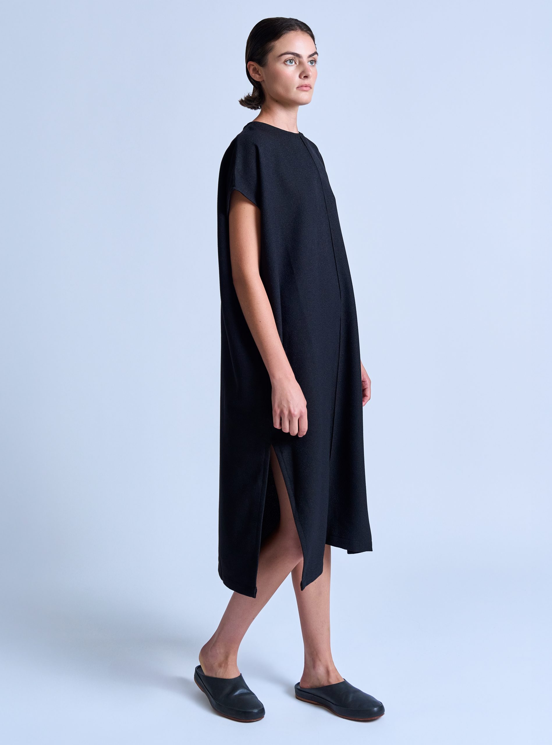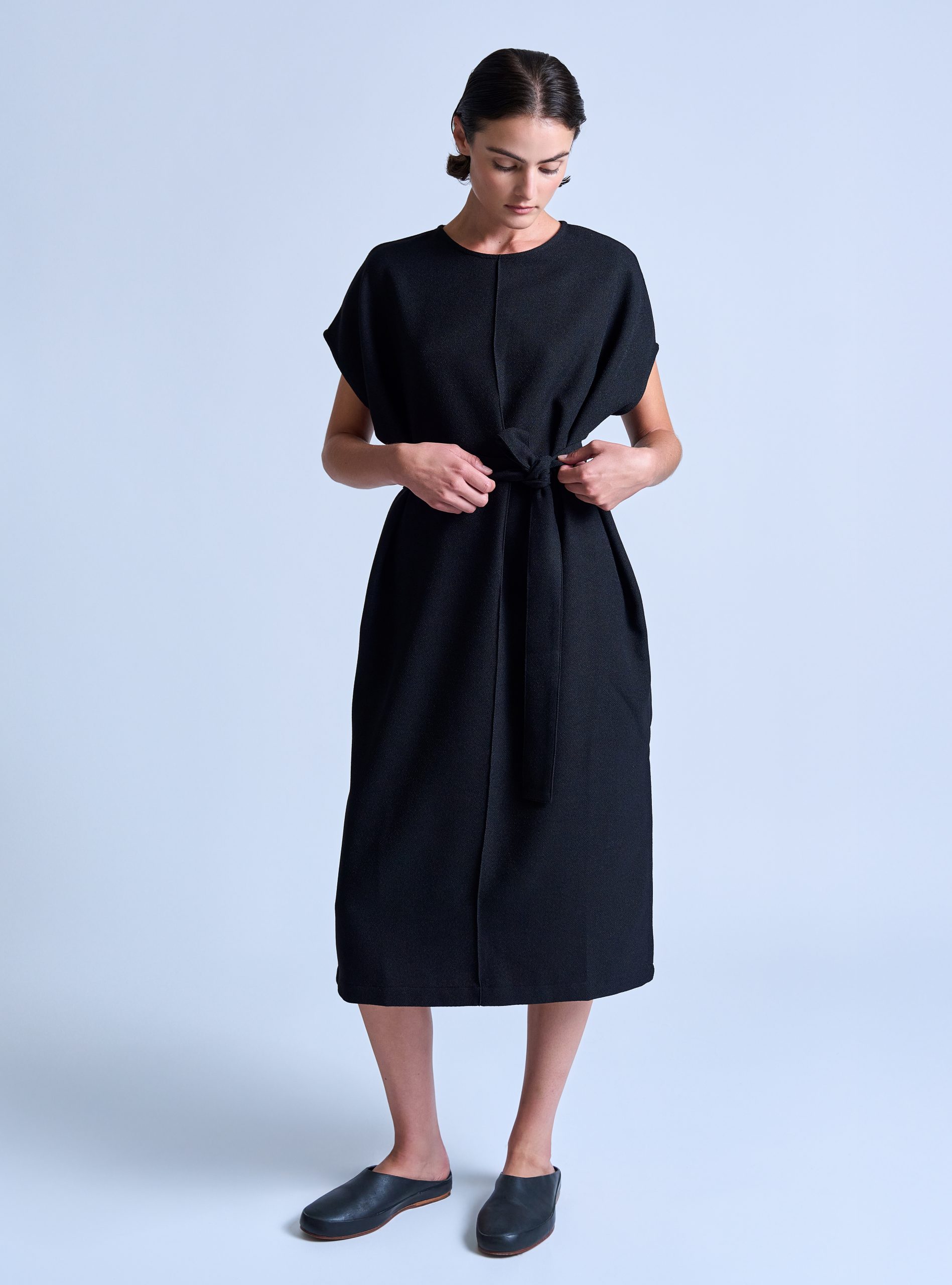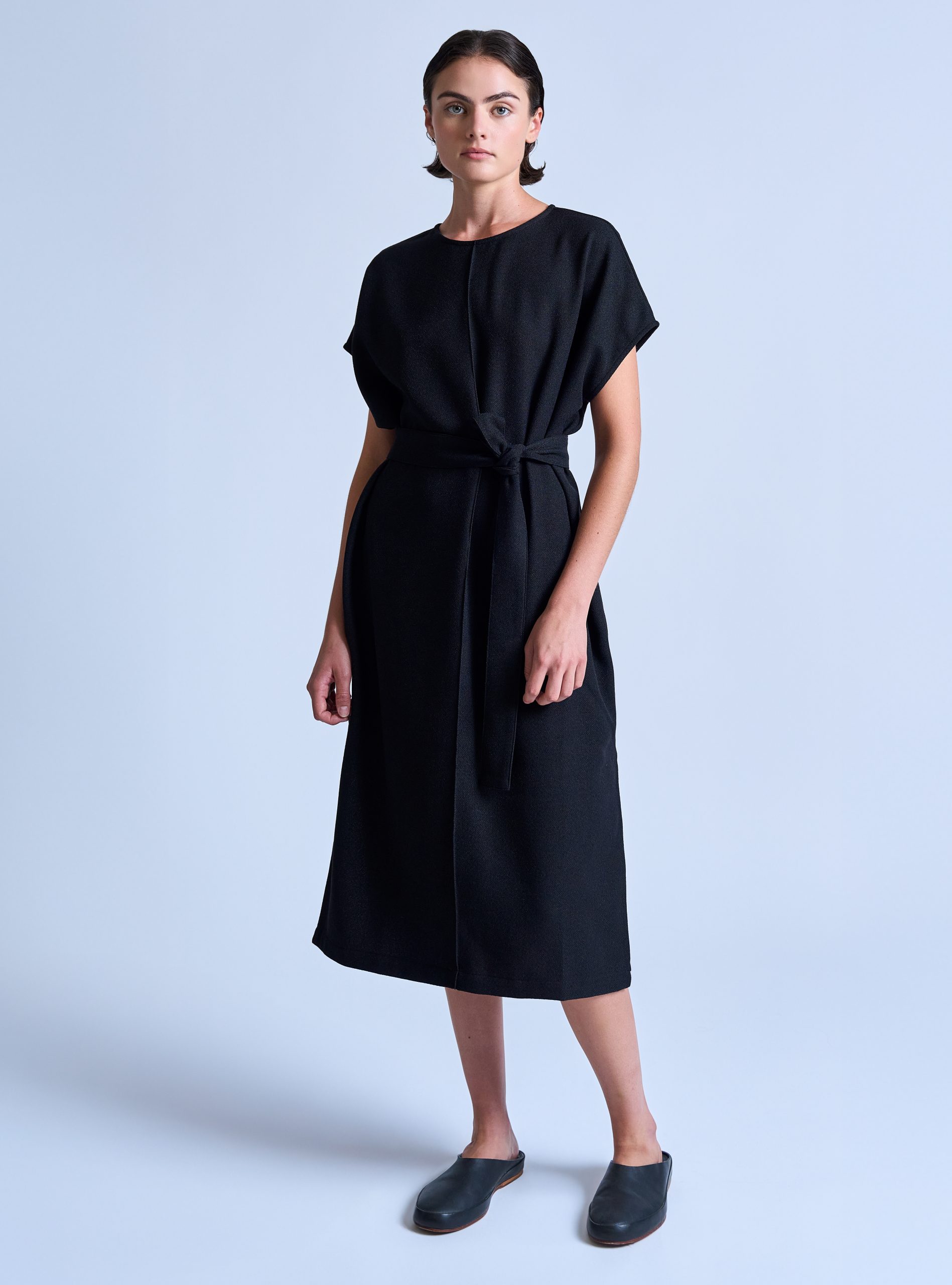 Ancient meets modern. The Chiton Tie Dress reinterprets the classic greek garment. It’s constructed of a Japanese crepe fabric that provides drape while maintaining its shape. A belt provides options to wear relaxed or tied for a different silhouette.