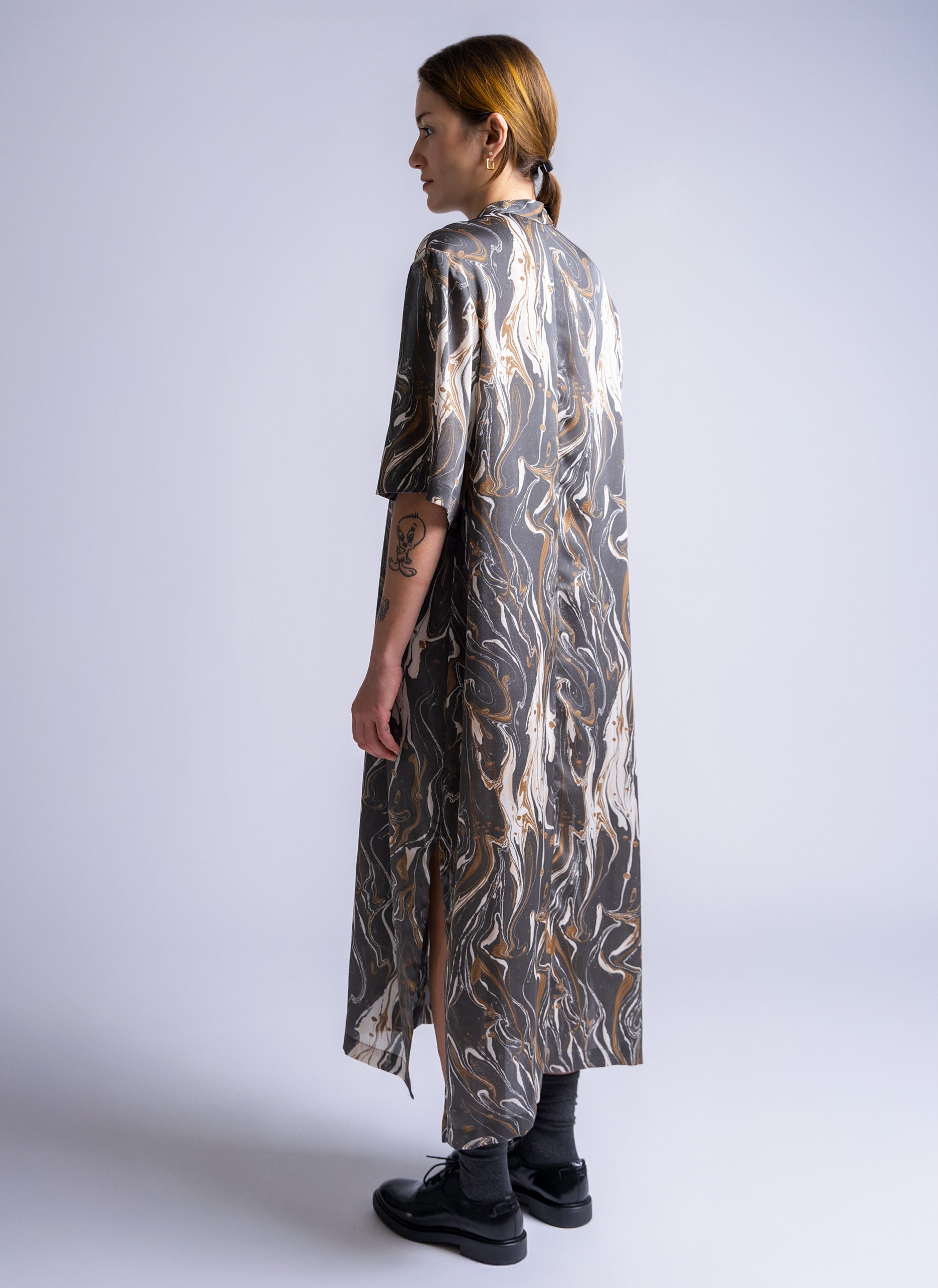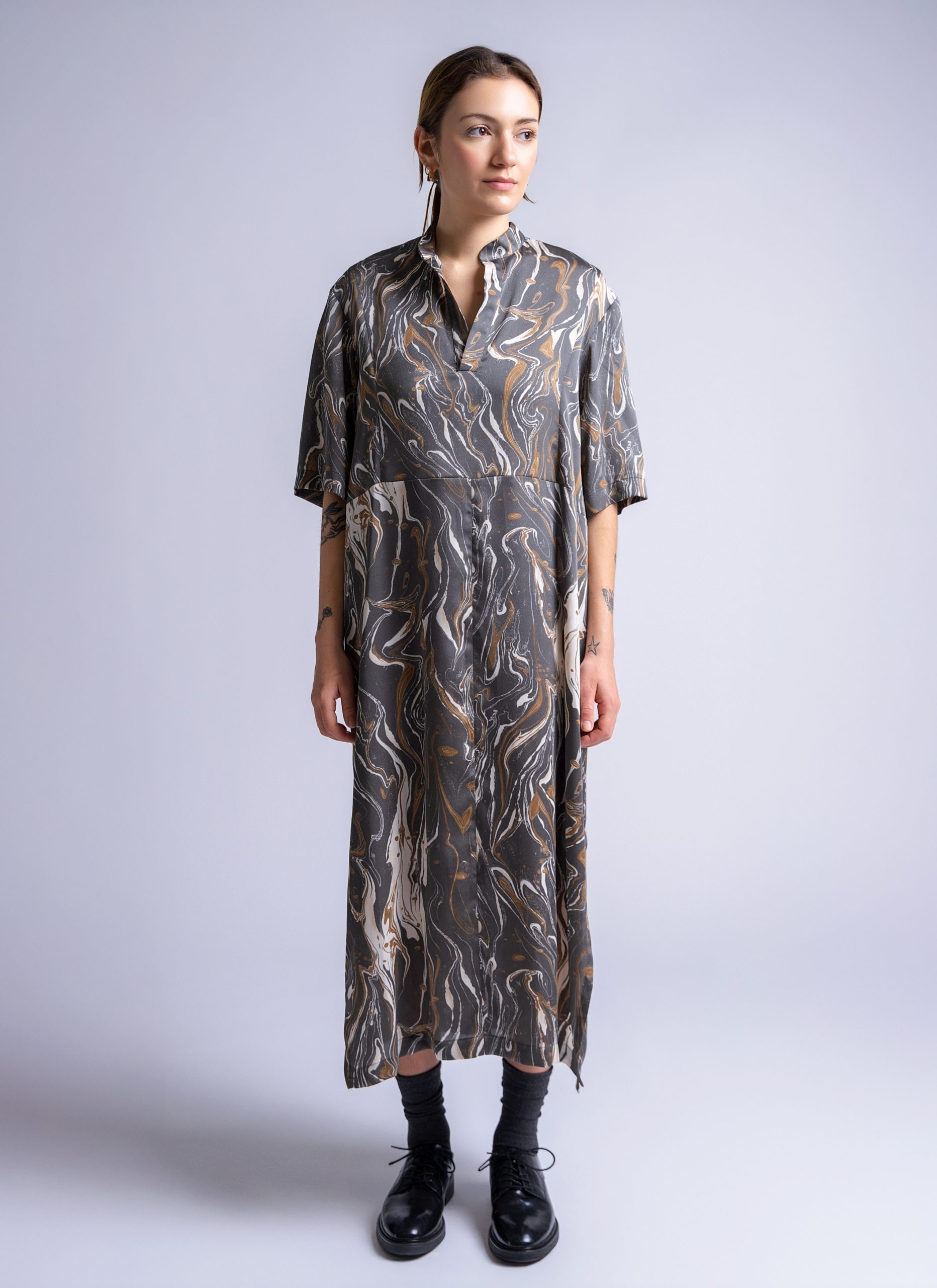 The Art of Dressing. The Gallery Dress offers a modern silhouette perfect for both day and evening occasions. Constructed of a 70s inspired marbleized print on a silk-like fabric for the perfect drape. Cut with an open placket, slide slits and a short, relaxed sleeves. Making it flattering for various body types.