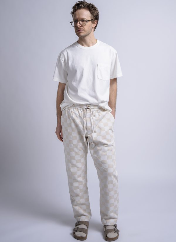 Easy in all the right places. The Relaxed Gusset Easy Pant comes constructed in check screen printed cotton twill, a relaxed fit, tapered leg, crotch gusset design for comfort. Like your favorite pair of jeans, this garment is intended to get better and better with age.